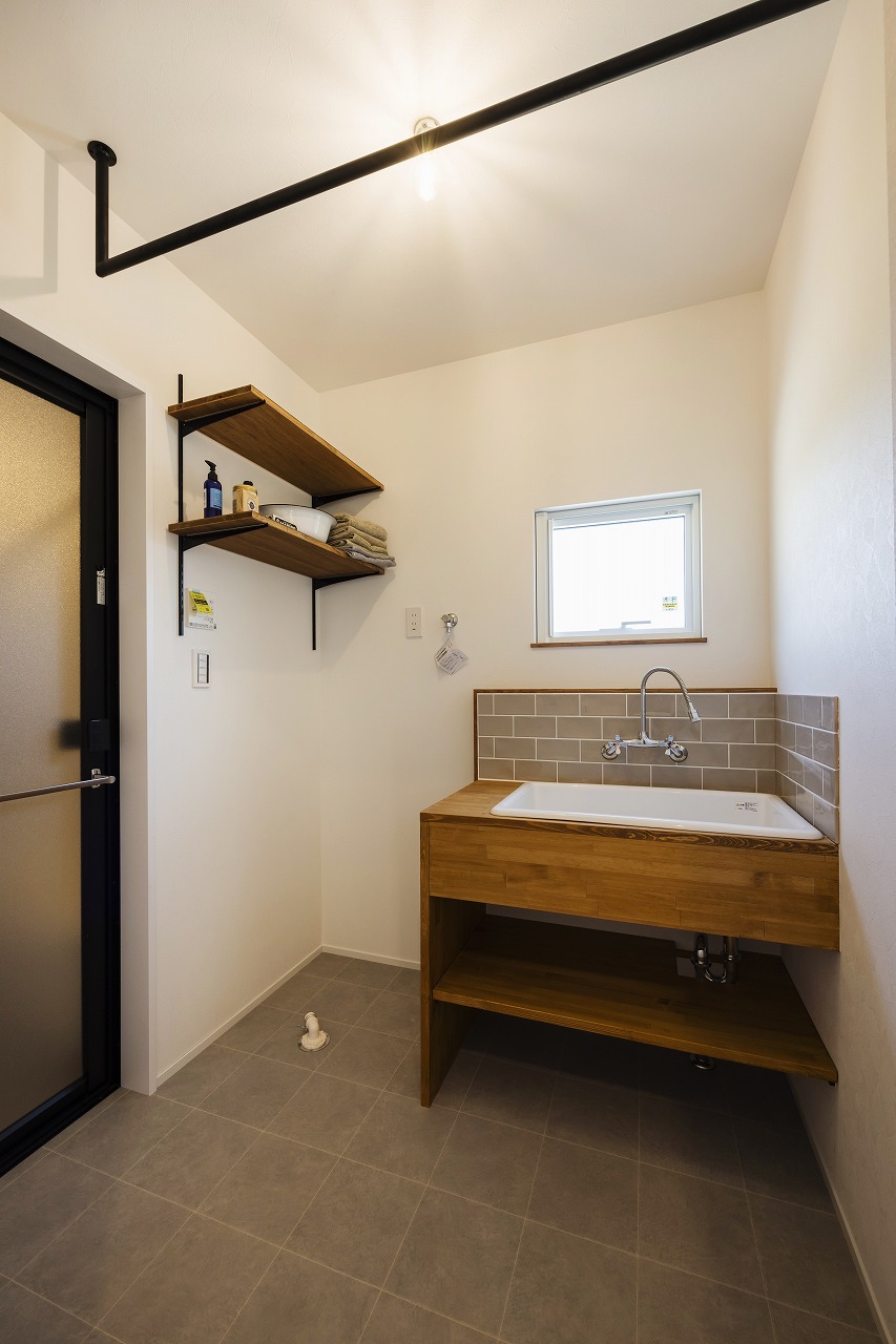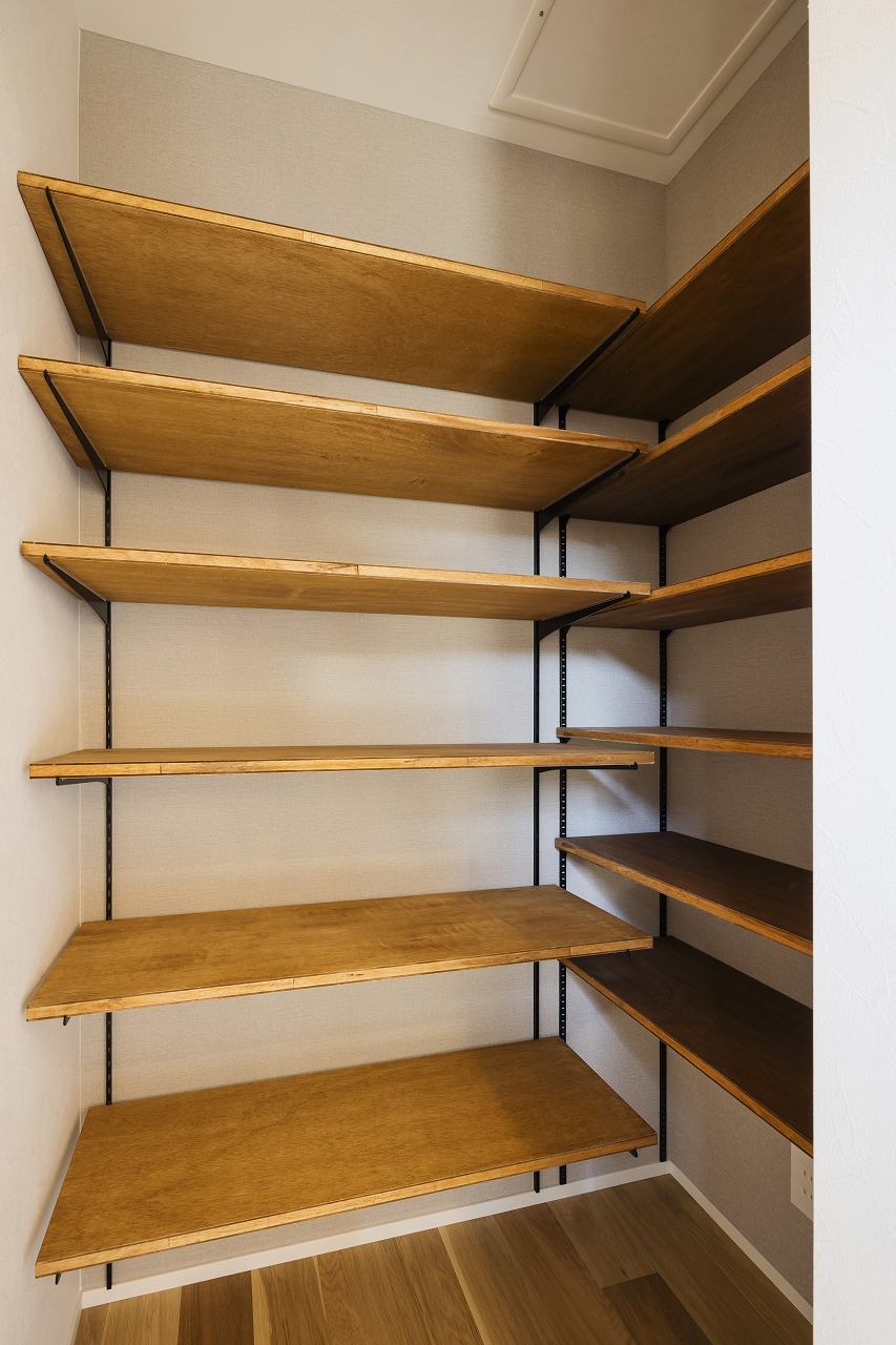 吹き抜けのリビングは、たっぷりの自然光が差し込んで、開放感たっぷり。 高い天井と大きな窓から注ぐ光が部屋全体を明るく照らし、朝の始まりを元気にしてくれる空間に。 木の温もりが感じられるインテリアと、複数の場所に設置した、優しいカーブを描くアーチ壁で空間に柔らかさと温かみをプラス。リラックスした雰囲気を作り出し心地よく過ごせます。 このLDKは、家族が自然と集まり、穏やかで心地よい時間を楽しむのにぴったりな場所です。 キッチン横の大型で出入りしやすいパントリーは、紺色の壁紙が空間をぐっと引き締めてシックな印象です。 洗面所とランドリー兼脱衣室は、引き戸で仕切られているため、プライバシーを確保しながらも家族全員が 使い勝手が良く、家事の動線もスムーズで、ゲストも快適に利用できるよう配慮されています。
