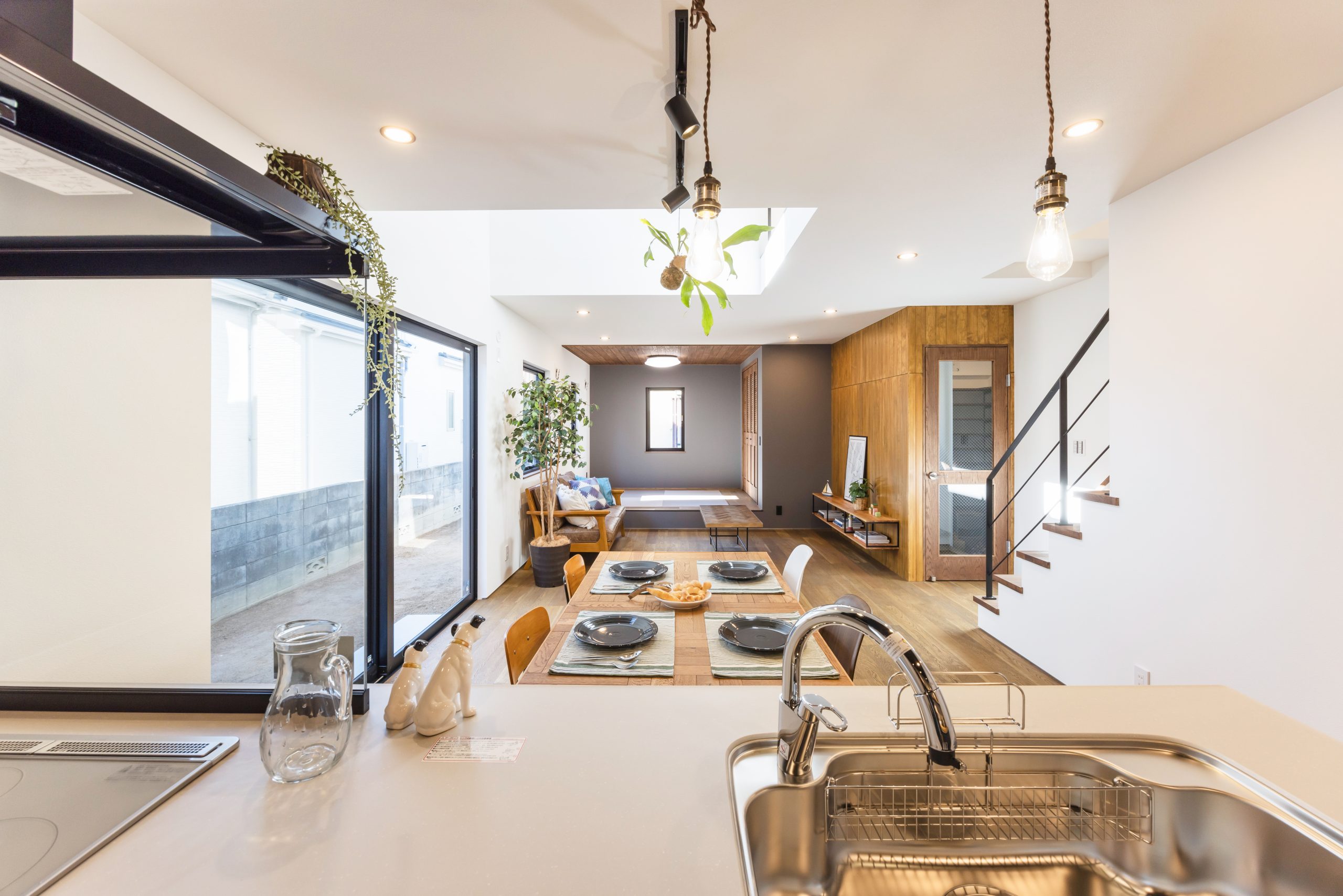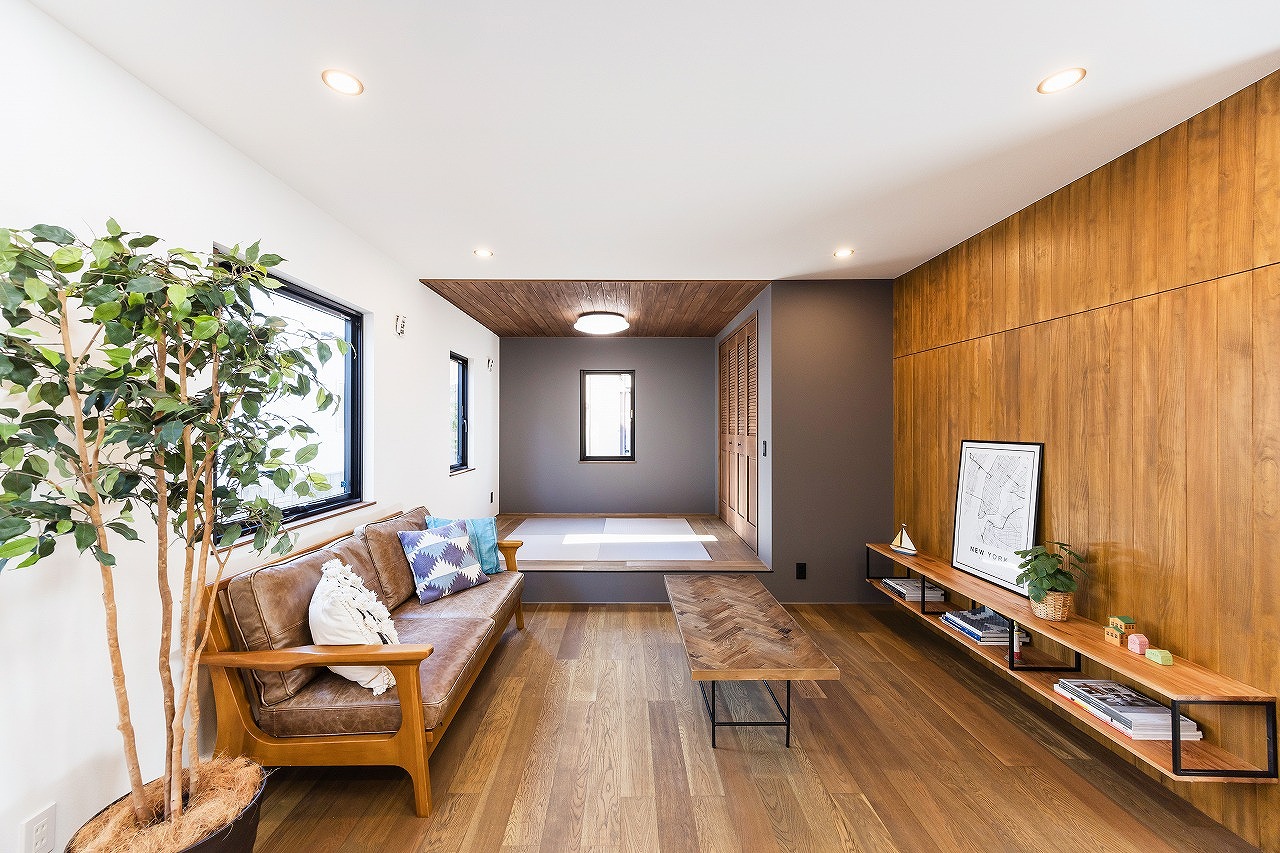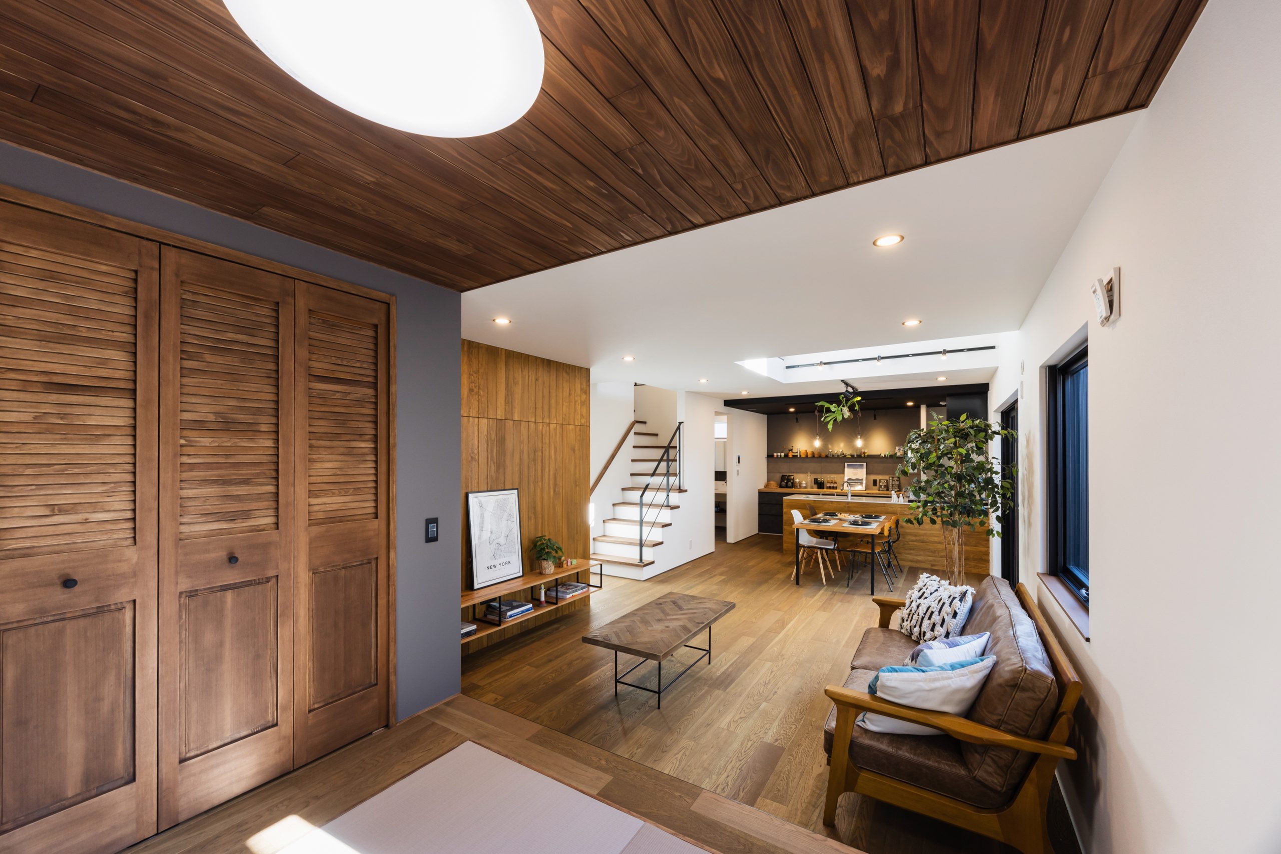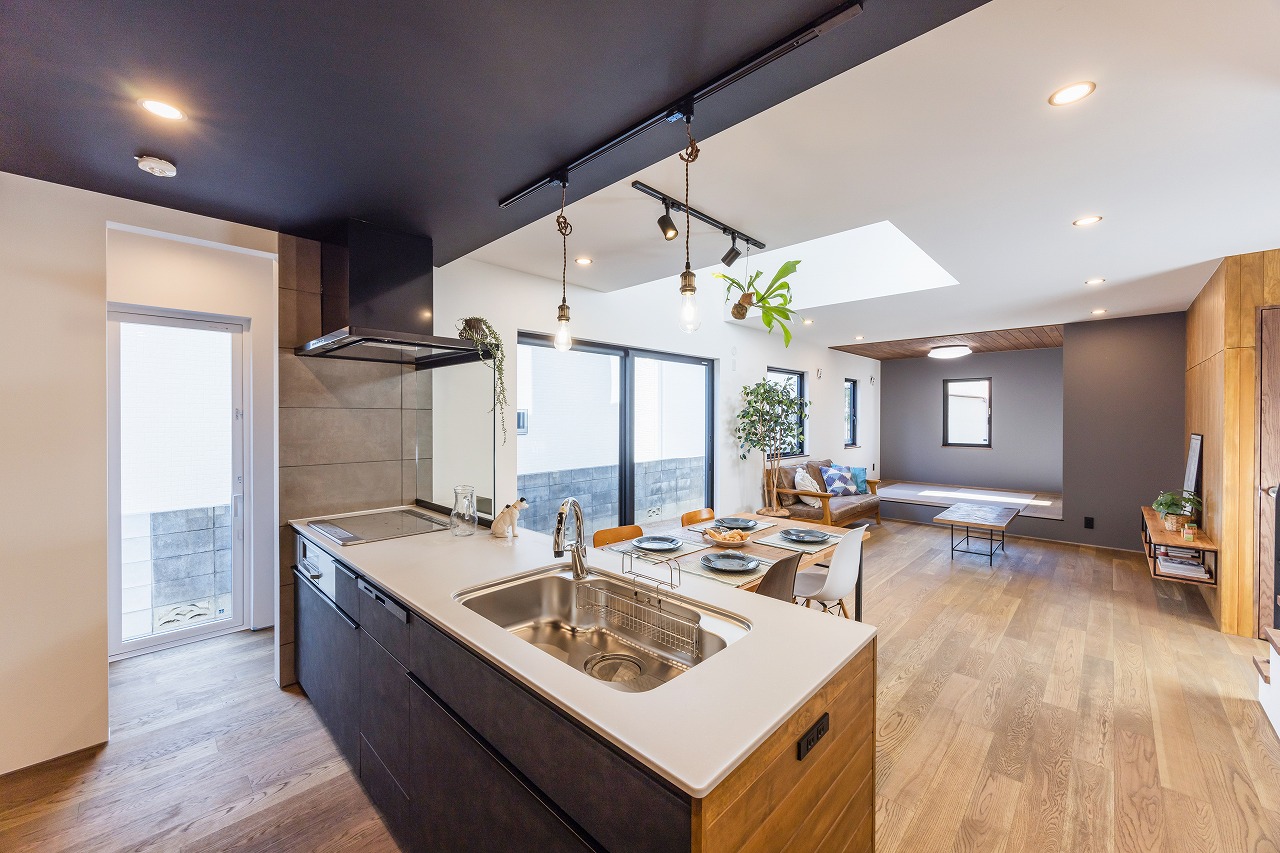 家に帰った瞬間、つい足を止めて見惚れてしまう––そんな空間がある心地よさを、しみじみ感じる住まい。 グレーの濃淡が生む奥行きとさりげない表情が、暮らしに落ち着きを添えるキッチン。主張しすぎない“大人の余裕”が漂い、照明が灯る夜には、昼とはまた違う特別な雰囲気が広がります。 そして、気づけば家族が自然と集まっているのは畳の上。ごろりと横になったり、お昼寝したり、子どもの遊び場になったり––ソファも良いけれど、畳がくれる“くつろぎの特等席”はやっぱり別格。和室の良さを、令和の今こそ改めて感じられる空間です。 さらに、この住まいの1階は廊下をなくした設計に。洗面も生活動線上に配置し、家の中をスムーズに移動できるので、毎日がストレスフリー。最短距離で動けるため、自然と時短にもつながります。 心地よさと機能性を両立した、のびやかに暮らせる住まいです。